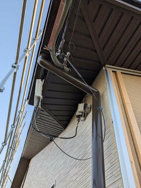 耐久性・耐候性に優れたガルバリウム鋼板「ニスクPro(カラー:GHV22)」を使用して軒天を仕上げていきます。美しい仕上がりはもちろん、建物を長期間守るための大切な工程です。