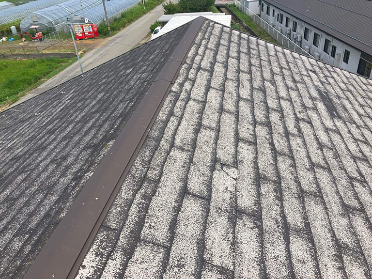 経年劣化により、既存のスレート屋根全体に著しい色あせやコケ、汚れが目立っていました。屋根材自体の防水性能が低下しており、このまま放置すると雨漏りなどのトラブルにつながる恐れがある状態でした。