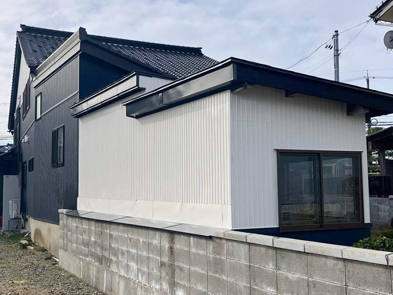 手前の増築部はホワイト(N-25)で明るく仕上げ、奥の母屋のダークカラー(92-25B)と組み合わせることで、奥行きのあるモダンな外観を実現しました。