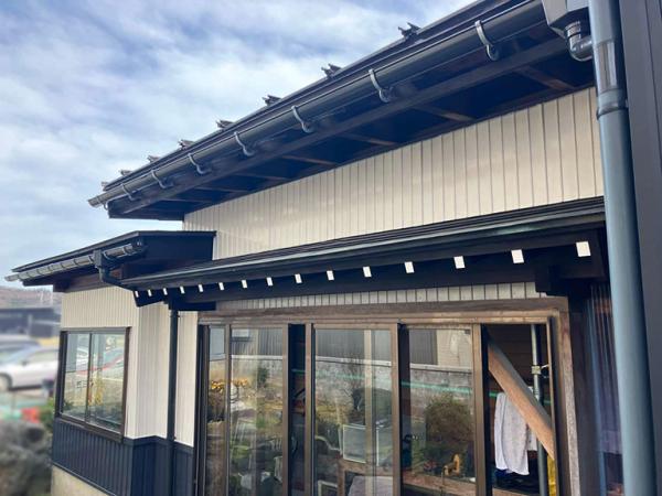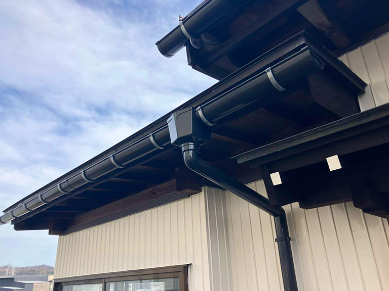雨樋交換工事後の様子です。新しい雨樋の艶やかな黒が、軒先のラインを美しく引き締めています。軒天や破風などの付帯部もしっかりと塗装を行い、細部まで美しい仕上がりとなりました。