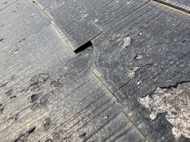 実際に現場を確認すると、部分的にスレートが欠けている箇所 がいくつも見られました。こうした欠けやひび割れは、雨漏りのリスクを高めるだけでなく、風で飛ばされる可能性もあるため注意が必要です。